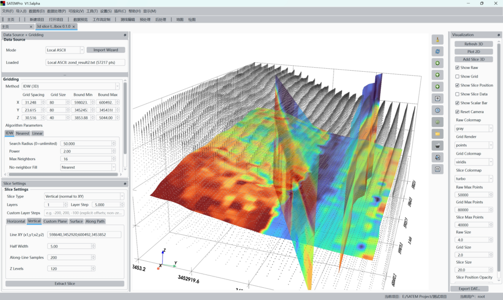 ThreeDSliceToolboxPlugin 用于三维散点数据(x, y, z, value)的网格化插值、多类型切片提取、三维/二维可视化与 DAT 导出。