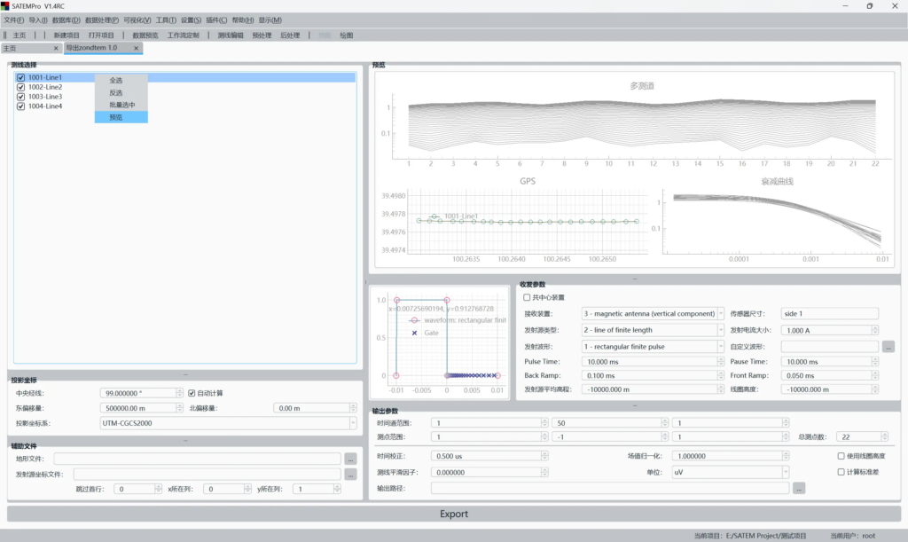本插件用于导出zondtem1d反演所需要的tdf文件格式,支持设置收发装置类型与发射波形,支持测线平滑、测点抽稀、时间校正、归一化、根据测点坐标提取地形数据。