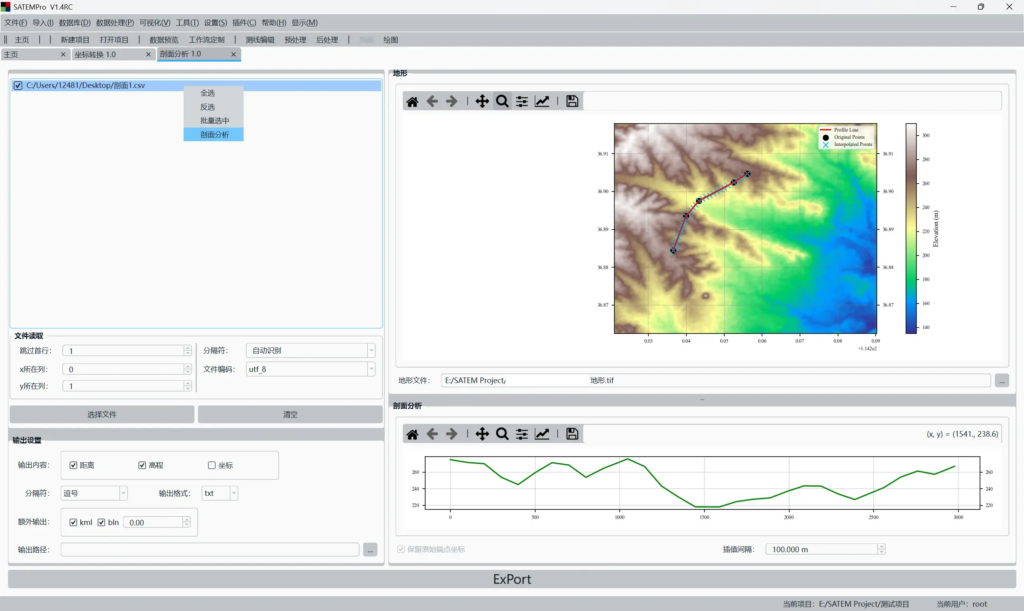 剖面分析2025年8月12日sunhf插件商城DEM, elevation, export, plugin, tif, toolbox 从tif文件中批量提取剖面线对应的地表高程数据,可直接生成bln白化文件、 插件下载及使用说明请参考: https://www.yuque.com/sunhuaifeng/satem/dd4ddgqrb1ge7q9h